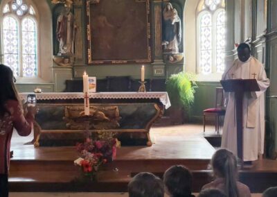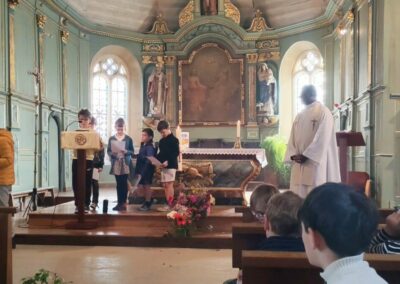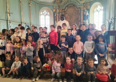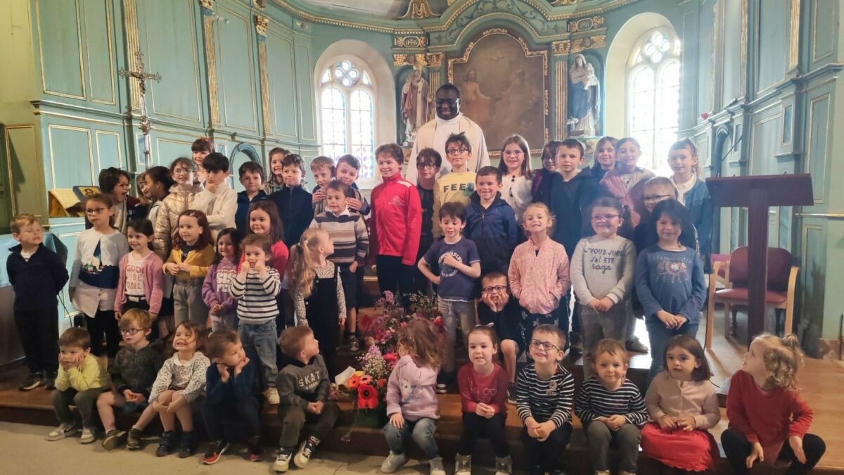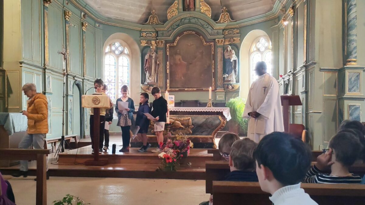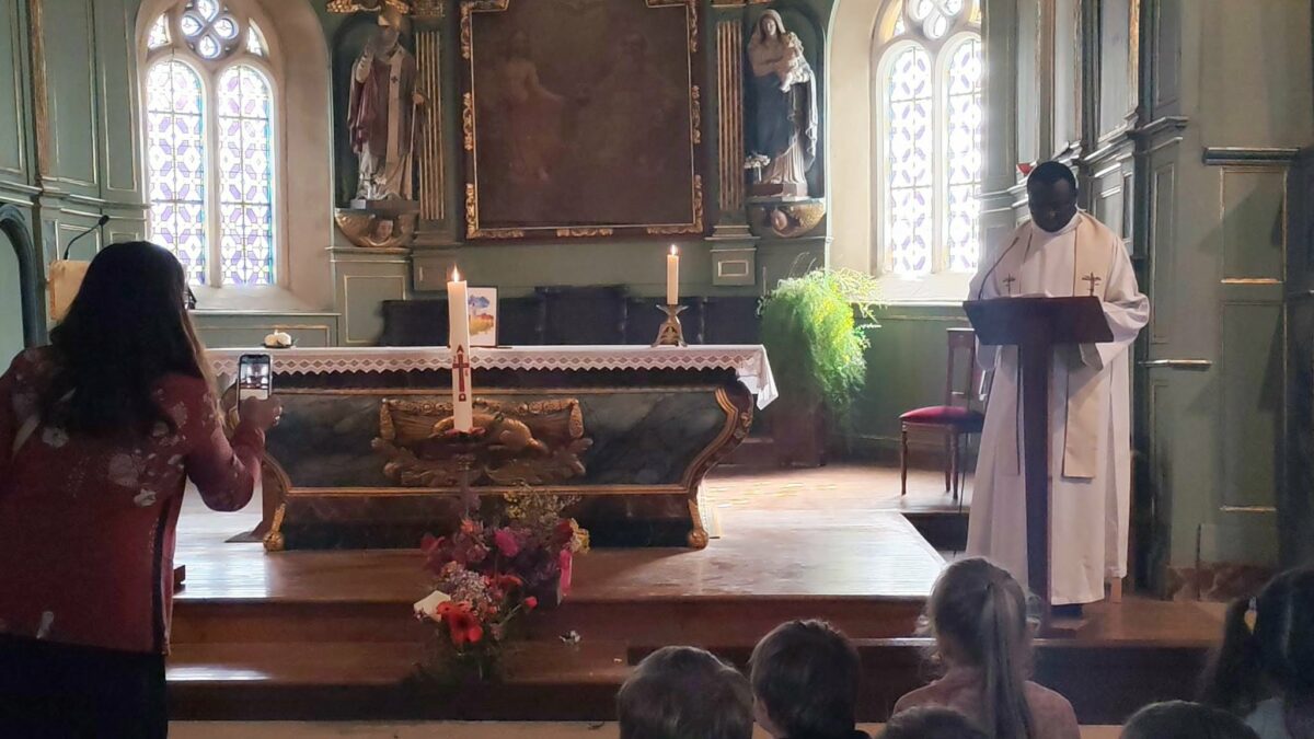 Les élèves ont retrouvé le Père Serge lors de la célébration de Pâques, un moment important autour du thème du renouveau. Pour symboliser la résurrection du Christ, mais aussi le retour du printemps, chaque enfant avait apporté une fleur. Ensemble, ils ont constitué une grande croix fleurie, représentant la vie, la renaissance et l’espérance.