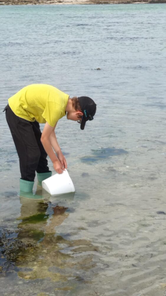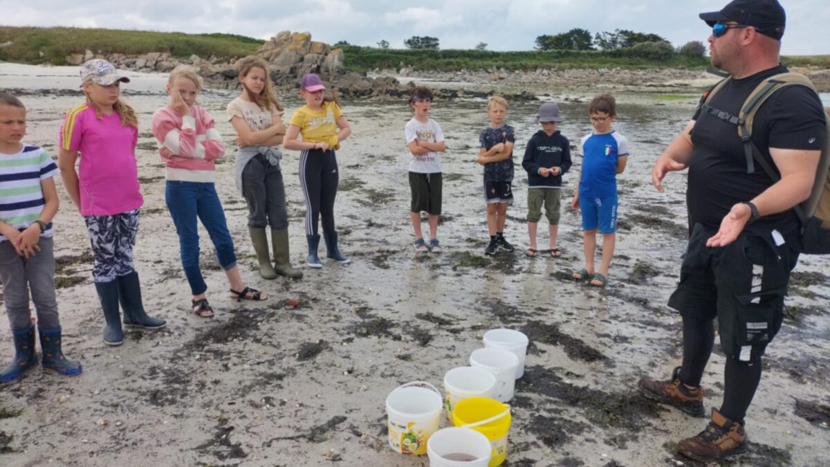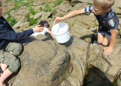 Quel bel après-midi nous avons passé lors de notre sortie pêche à pied ! Par équipes, les enfants sont partis à la découverte de l’estran avec un seau pour mission : recenser le plus grand nombre d’espèces possible… mais en respectant une règle importante : pas plus de deux représentants par famille pour préserver l’environnement. Pendant 2h30, les petits explorateurs ont arpenté les rochers, soulevé les algues, observé avec attention chaque recoin. Leur curiosité, leur enthousiasme et leur esprit d’équipe ont porté leurs fruits : 32 espèces différentes ont été identifiées ! Un score impressionnant, et surtout une belle preuve d’observation. Parmi les trésors découverts : poissons-chats, lièvres de mer, congres, crabes-araignées, un bébé homard, un tourteau, des crevettes, des anémones, des actinies, des étoiles de mer, des vers néreis, des palourdes, des vieilles, des monodontes… Chaque trouvaille a été accueillie avec émerveillement ! Les enfants ont pris énormément de plaisir à cette activité grandeur nature, entre science, aventure et respect du vivant. Une expérience riche, qui restera sans aucun doute un souvenir fort de leur séjour !
